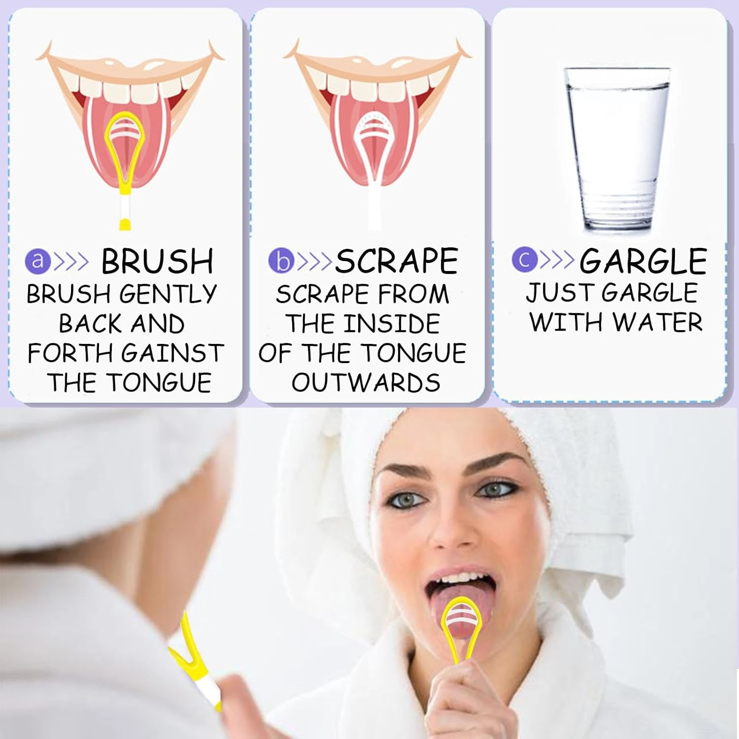 - سهلة الاستخدام : تحتاج فقط إلى سحب لسانك، ثم وضع مكشطة اللسان على سطح لسانك، وانزلق بلطف على طول لسانك من الخلف إلى الأمام،وتكرار الكشط لتحقيق نتائج أفضل. بعد الاستخدام، اشطفيه بماء نظيف.